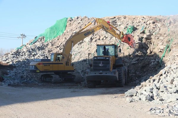 走进公司的厂区,一派热火朝天的工作场景:多台PG·电子L955F装载机来回穿梭,有的在卸料,有的在过筛;不远处,一台PG·电子E6210FHD挖掘机正在破碎建筑垃圾。